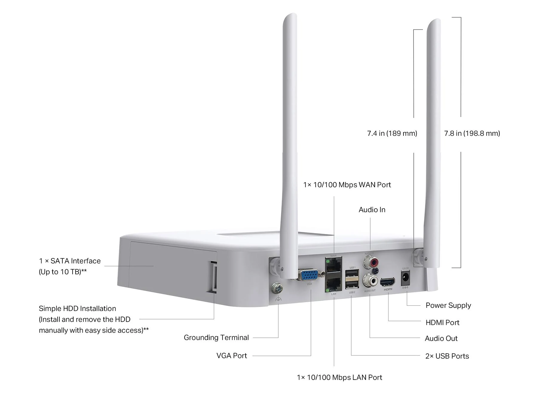The VIGI NVR1108H-W is equipped with one SATA interface that supports up to 10TB hard drive capacity (HDD not included), allowing users to store weeks or even months of high-definition recordings. Whether for retail monitoring, perimeter surveillance, or indoor observation, this recorder provides long-term, reliable video storage.