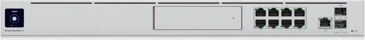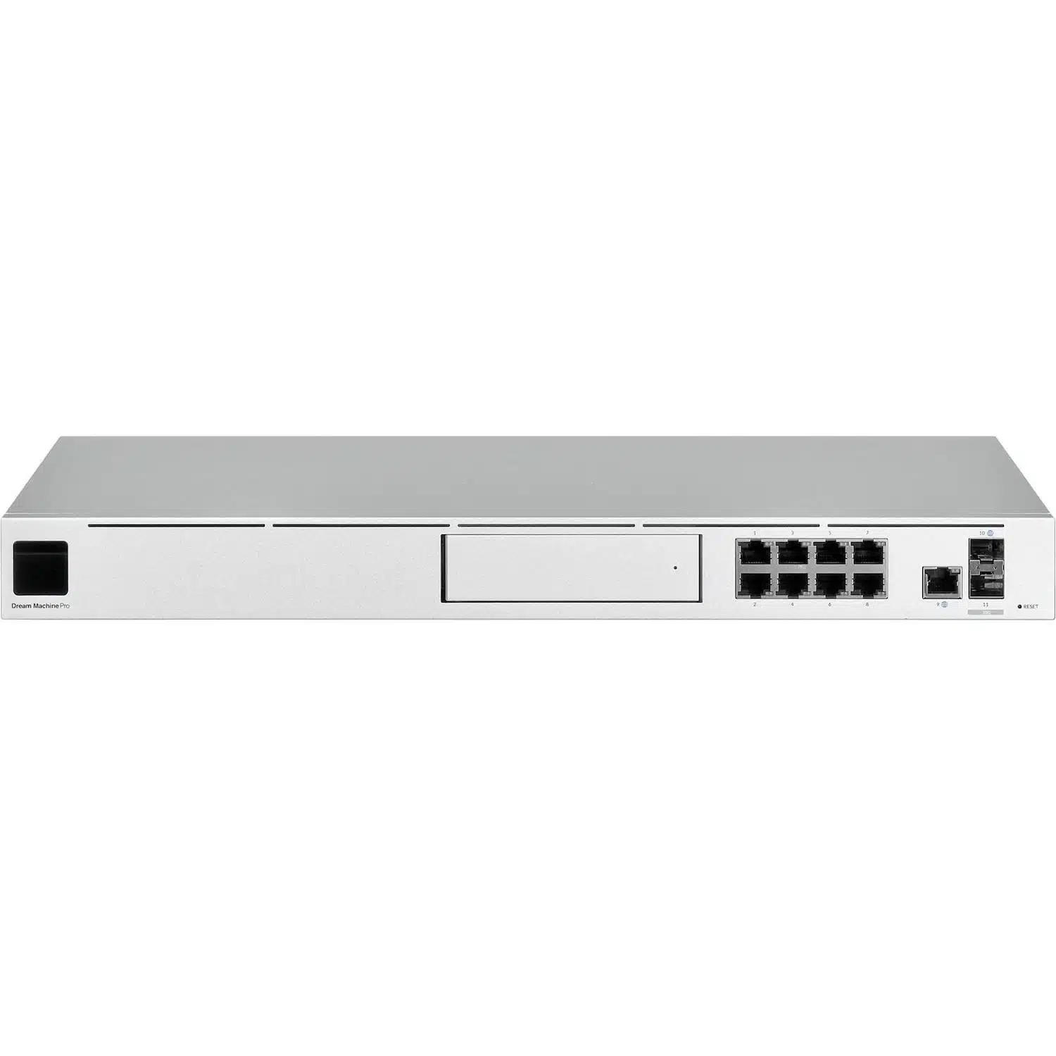 The Ubiquiti UDM‑Pro includes a hot‑swappable 3.5‑inch drive bay dedicated to UniFi Protect NVR (drive sold separately). With integrated camera management, recording, playback, and analytics, it consolidates security appliances into one platform.