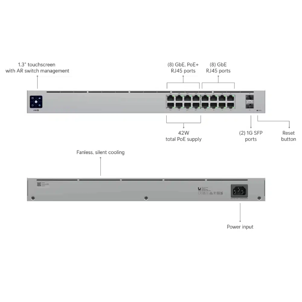 - 16 × Gigabit RJ45 ports (42 W PoE budget)